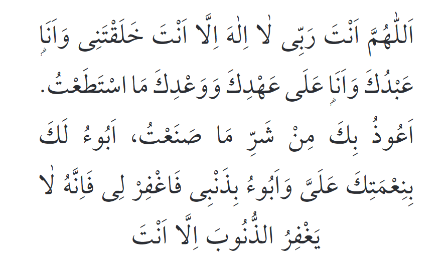Okunuşu: Allahumme ente Rabbi La ilahe illa ente halagteni ve ene abduke ve ene ala ahdike ve vadike mestadatu euzu bike min şerri ma sanatu ebuleke bi nimetike aleyye ve ebubi zenbi fağfirli zünübi fe innehu la yeğfiruzzube illa ente birahmetika Ya Erhamerrahimin.